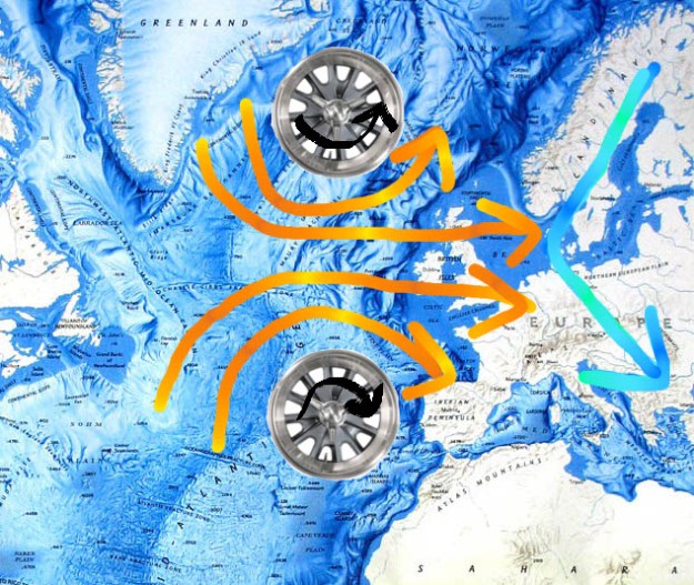Bu basınç merkezlerini, durmadan dönerek çevrelerindeki havayı belirli bir yöne doğru hareket ettiren tekerlere benzetebilirsiniz. Normalde, aynen yukarıda görüldüğü gibi, Azor adaları merkezli teker saat yönünde, İzlanda’daki teker ise saatin tersi yönde döner ve kışın nispeten ılık olan okyanus havasını (Atlas okyanusu neden ılık? Okyanus akıntılarından!) Batı Avrupa üzerine taşır. Tekerler ne kadar hızlı dönerse (yani basınç merkezleri ne kadar kuvvetliyse) soğuk havanın kuzeyden ve doğudan Batı Avrupa’ya yaklaşması o kadar zorlaşır.