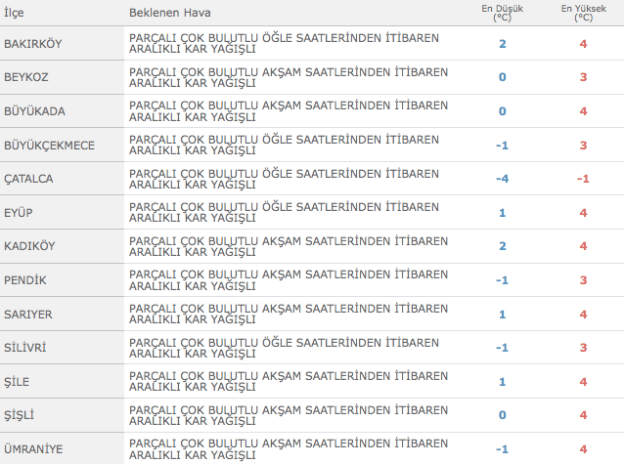 Ne deniyor: İstanbul’un tüm ilçeleri öğle/akşam saatlerinden itibaren aralıklı kar yağışlı! Ve hiçbir ilçenin en yüksek sıcaklığı 5 derece değil! Hepsi 5’in altında.
