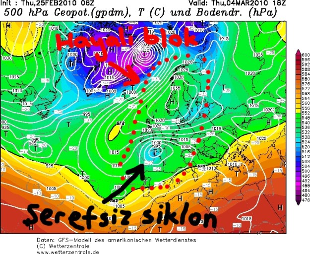 Skiciyiz.biz’de bugün çıkan yeni yazımda Mart soğuk ve karlı olacak gibi görünüyor dedim, fakat Atlas Okyanusu pislik çıkarıyor. Batı Avrupa üzerinde kuzey-güney doğrultusunda oluşacak bir yüksek basınç ayın 5’inden itibaren blocking‘e yol açarak uzun süre Türkiye’nin soğuk kalmasını sağlayacaktı, fakat fırsatçı bir atlantik siklonu o yüksek basıncın altını oymaya çalışıyor. 180 saat sonrasına ait GFS çıktısı bu savaşı açıkça gösteriyor: