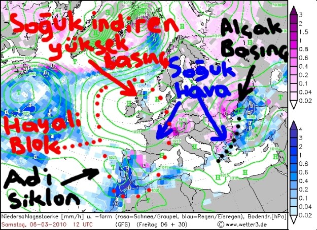 Yukarıda gördüğünüz çıktı GFS modelinin yarın (Cumartesi) Türkiye saatiyle 14 için olan basınç ve yağış yoğunluğu haritası. Yeşil çizgiler basıncı gösteriyor. Maviler yağmuru, pembeler sulu kar ve karı belirtiyor, renkler koyulaştıkça yağış artıyor. Genel durumu bu harita üzerinde özetledim. Dikkat etmemiz gerekenler: İngiltere üzerinde konumlanan bir yüksek basınç var. Kuzey yarımkürede hava kütleleri yüksek basınç merkezlerinin etrafında saat yönünde hareket ederler. Bu yükseğin doğusundaki soğuk hava da buna uygun olarak güneye doğru hareket ediyor. Fakat dikkat edin: Geçen yazılarımdan birinde bahsettiğim Atlantik siklonlarından (alçak basınç) bir tanesi Portekiz’in hemen batısında, biraz zayıflamış da olsa yükseğin altını oyma işini başarıyla yerine getiriyor. Bir diğer alçak basınç da Almanya’nın güneyinde faaliyet halinde, yüksek basıncın doğuya doğru da genişleyerek soğuğu Türkiye’ye doğru ittirmesine mani oluyor. Bu alçak basınç ise Kuzey Denizi, yani yine Atlantik uyruklu. Bu iki şerefsiz siklon, kesik kesik kırmızı yuvarlakla belirttiğim, hatta gösterdiğimden daha da fazla genişleyebilecek bir yüksek basıncın (blocking) oluşumuna engel oluyor. Eğer o geniş yüksek basınç oluşabilseydi, soğuk havanın batıya doğru gösterdiğim rotası iptal olacak, soğuk, Avrupa’yla paylaşılmadan ikinci rotadan olduğu gibi Türkiye’ye inecekti. Bu gerçekleşmiyor.