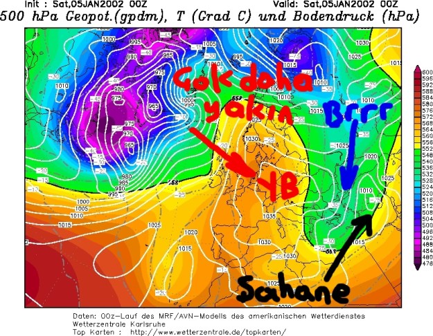Gelelim bu sistemin, daha önce gerçekleşen bazı kar yağışlarına benzediği ve onlar gibi sürpriz yapabileceği iddiasına. 1987 Mart benzetmesi için parmaklarımı yormak istemiyorum, rica ederim o zamanki basınç dağılımını ve soğuğun gücünü kendiniz bir inceleyin. Bir de, 2002’ye benziyor diyenler var. 4-5 Ocak 2002’den bahsediliyorsa eğer, o zamanki basınç haritasını aşağıda gösteriyorum: