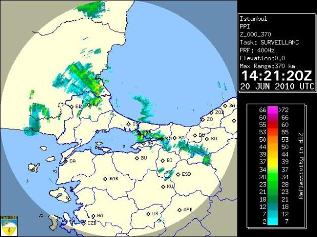 Saat 17.21’de kaydedilen radar görüntüsü de aşağıda. İstanbul radarı genelde renkleri sarı ve kırmızı tonlara doğru çok abartmıyor, yani gördüğünüz sarı renk çok kuvvetli bir gökgürültülü fırtınayı işaret ediyor.