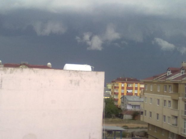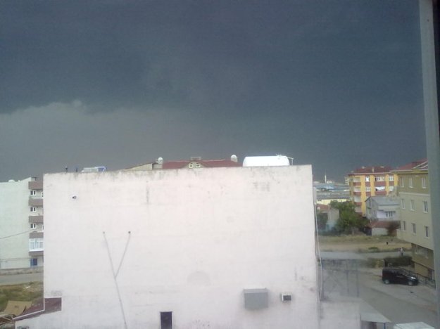 Yarım saat öncesine kadar inanılmaz sıcak ve basık olan havanın bu durumu daha fazla kaldıramayacağı, havanın giderek kapanmaya başlamasıyla belli olmuştu. Ve bu kararma giderek daha korkutucu ama bir o kadar da heyecan verici bir hal alıyordu. Rüzgar o kadar şiddetliydi ki, gittikçe yoğunlaşan ve koyulaşan bulutlar, hızlandırılmış çekim varmış gibi müthiş bir hızla hareket ediyorlardı güneyden. Kümülonimbuslarla beraber mammatus bulutları ortalığı ele geçirmişti çok kısa bir sürede. Tepemdeki bulutlara dikkatli bakınca dönme hareketine başlamış olduklarını farkettim. Henüz yere ulaşan herhangi bir huni oluşumu yoktu ama her an bir hortum çıkabilirdi. Çok güçlü rüzgarlar ve şimşekler eşliğinde yaklaşan ve yeşilimsi siyah bir renge bürünmüş tabakayı görünce farkında olmadan irkildim. Bu esnada, yaklaşık 1 km ötede bulunan inşaat halindeki binadan kopan parçaların havada dönmeye başladıklarını farkettim.  Dönen parçaların istikameti tam bizim binanın olduğu taraf idi! Sonunda bunun olağandışı bir durum olduğunu farkeden insanlar binaların içine kaçışıyordu.  Balkonda zor duruyordum ve beni yerimden oynatan rüzgarın da etkisiyle  içeri girmek zorunda kaldım. Birkaç saniye içinde bizim binanın bulunduğu bölgede dolu başladı ve yerden savrulan parçacıklarla beraber göz gözü görmüyordu. Az evvel yaklaşmakta olduğunu gördüğüm bulutlar tam üzerimizdeydi ve durmadan şimşek çakıyordu. Dolu uzun sürmedi, iki-üç dakika sonra yerini yağmura bıraktı. Yoğun bulut kütlesi üzerimizden geçmişti ama rüzgar çok şiddetliydi hala. Tekrar balkona çıktım ve derin bir oh çekmişcesine rahatlayan hava, pencerelerdeki korku ve şaşkınlık dolu bakışlar eşliğinde dağılıyordu artık.