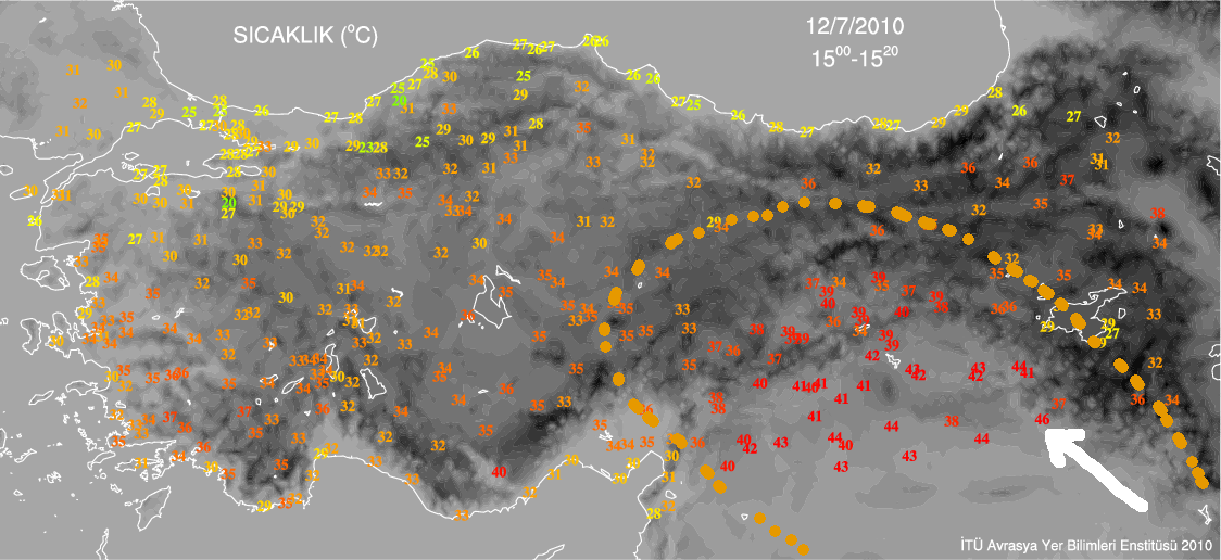 46.3 bana çok gerçekçi gelmedi, Basra’nın merkezinde bile ancak 46 C oluyor, gecen günlerde Kuveyt de 50 C oldu ama o da çok az rastlanilan bir durumdu. Sizce DMİ’nin Cizre ölçümünde hata olabir mi?
