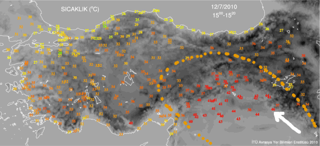 Yerel etkilerle gayet olası, Cizre zaten aşırı sıcağıyla ünlü bir yer. DMİ’nin verilerine göre Cizre maksimumları: Bugün 43.6, dün 45.3, salı günü 46.6, pazartesi 44.6 …