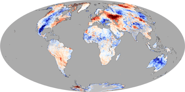 Yukarıdaki harita, 4-11 Temmuz tarihleri arasında kara yüzeylerinde ölçülen sıcaklıkları normallerden fark olarak gösteriyor. Turuncu-kırmızı tonlar normalden sıcak, mavinin tonları ise normalden soğuk. Orijinalini burada görebilirsiniz.