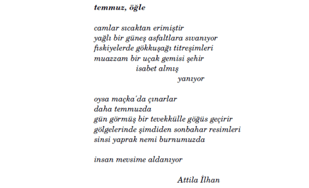 İlhan, büyük şairdi. Bulutlarla, şimşeklerle, karla kışla ilgili nefis laflar etmiştir. Sıcağı da es geçmemiş, görüyorsunuz. Bu mısraları acaba hangi tarihte yazdı, merak içindeyim.