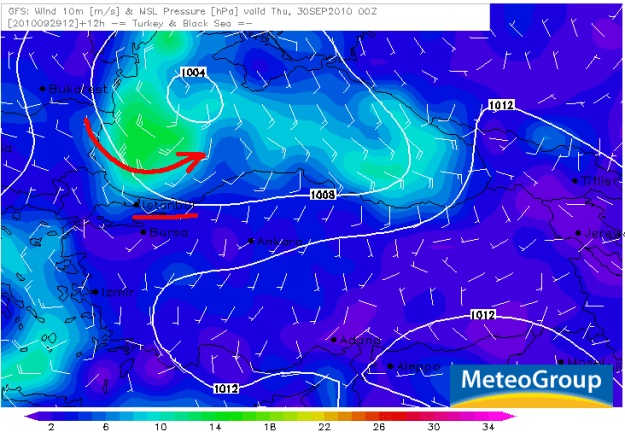 Kuzeydeki alçak basınç merkezinin konumundan ötürü rüzgar da deniz etkisiyle yağış hadisesi için elverişli değil: