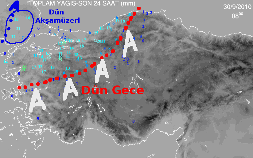 Radar görüntülerini izlediğimiz zaman yağışın Ege-İç Anadolu-Batı Karadeniz üçgeninde sıkıştığını görüyoruz.Yağış periyoduna baktığımız zaman;Marmara Bölgesi’nin kuzeyinde bir alçak basınç merkezi var.Diğer tarafta ise Göller Yöresi-Kars-Hakkari üçgeninde geniş bir yüksek basınç merkezi bulunuyor.