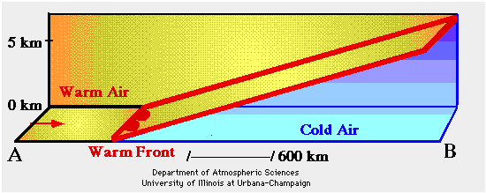 Sıcak cephelerin ön kısmında, yani yukarıdaki haritada kırmızıyla sınırlanan alanda yağış vardır. Cepheye yaklaşıldıkça yağış artar (yağışın en bol olduğu kısma dikkat). Cephe gerisinde (cephenin güneyi) ise yağış bıçak gibi kesilir.