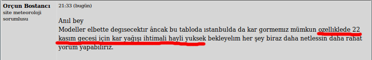 İstanbul’da, kasım ayında, bırakın orta şiddeti, hafif kar yağışı bile çok nadir görülen bir olaydır. Bence yaptığın tahminin (17 gün sonrasına orta şiddette kar) gerek bilimsel, gerekse istatistiksel olarak hiçbir dayanağı ve tutarlılığı yoktur. Sana güvenen okuyucuların elbet vardır ama beni ikna edemezsin. Ayrıca Ozan bu başlığı açtığından beri uzun vadeli kar tahminleri (uçuşları) kesildi. Bence objektif olarak bir öz-eleştiri yap.