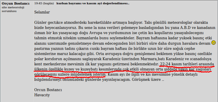 Yok yanlis anladin Sensei genelleme yapmadim, sen de biliyorsun az cok biz de tahmin yapabilme yetenegine sahibiz de Orcun Bostanci’yi basarili buldugum icin onun tahmininde heyecanlandim desem daha dogru olur o yuzden.Y oksa dedigim gibi millet sonbahar mevsiminde olmamiza ragmen yana yakila kar bekliyor. 1 hafta sonrasi icin 20 cm kar olacak desen, millet dese veriler gostermiyor bunu ama bu kisi benim ozel verilerim, yararlandigim baska gostergeler var dese o kisinin pesinden kosuyorlar. Bildigin Zubukzade oyunlari iste 🙂