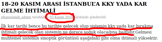 Guzel bir konu Sensei. Bu tahminleri verileri analiz edebilen cogu kisi yapabilir ama o kadar uzun sureyi goz onune alarak riske girmek istemez. Ama milletimiz o kadar sabirsiz ki hala sonbahar mevsiminde olmamiza ragmen neden kar yagmiyor diye agiz burun kiviriyor. Elbette ki bu durumlarda birkac kahraman cikacaktir. Verilen tarihlerde olasi kar veya sogukta el ustunde tutulacaklar, herkes onlarin agizlarina bakacak. Yukarida tahmin yapan kisiler hakkinda yorum yapmayacagim, az cok ne diyecegimizi bilirsin ama soyle diyeyim Efsane Semih neyse de Orcun Bostanci’nin bu kadar uzun surecte bu kadar kesine yakin yazmasina sasirdim. Cunku o forumun gecmis yillardaki sayfalarini da okudum ve bu kisiye ait uzun soluklu tahminler var ve cogunda da basarili hakkini vermek gerekirse. Bu yuzden her ne kadar bu surec falcilik da olsa yinede insani heyecanlandirmiyor degil. Sana da iyi hafta sonlari. Aralik ayinda kar tatili bile olacak, bunu da simdiden mujdeliyeyim tum ogrencilere 🙂