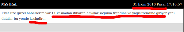 Son olarak yine HavaTurka’dan, Mistral rumuzlu arkadaşıma kulak verelim. Bu arkadaşımızın bir özelliği, meşhur Joe Bastardi’nin de mezunu olduğu PennState meteoroloji bölümünden mezun olması ve ayrıca zamanında NOAA’da da (Amerikan Milli Okyanus ve Atmosfer İdaresi) çalışmış olması. Hem bundan dolayı geliştirdiği kendine güveninden, hem de herhalde 31 Ekim’le 11 Kasım arasında sadece 12 gün olduğundan, soğuma ve yağış için kesin konuşmuş.