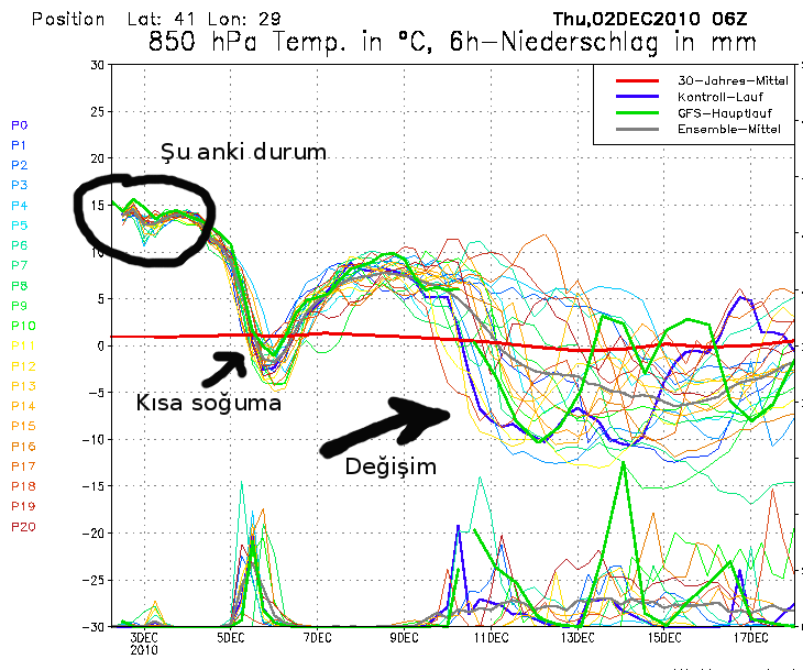 Öte yandan, bunun tam tersine doğru bir değişim ufukta göründü gibi. GFS tahmin modelinin 21 senaryosunun sıcaklık değerlerinin (aşağıdaki kırmızı renkli neredeyse düz çizginin altındaki ve üstündeki renkli çizgiler), 11 Aralık’tan itibaren ağırlıklı olarak tarihsel ortalamanın (kırmızı çizgi) altında kaldığını görüyoruz. Fakat sözünü ettiğim tarih aralığına en az 9 gün olduğu için herhangi bir şeyden emin olamayız. Takip edelim bakalım neler olacak.