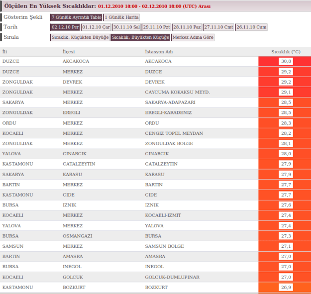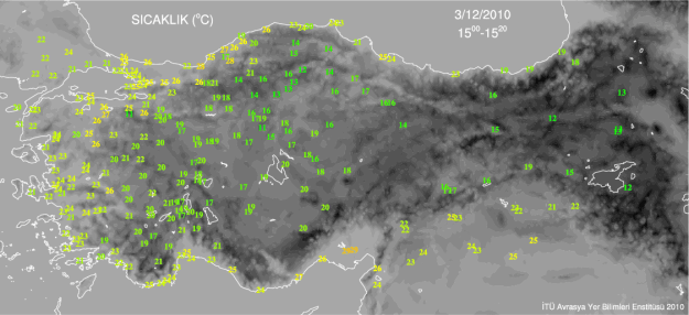 2010 yılı, klimatoloji kitaplarını yeniden yazmaya devam ediyor. Bazı merkezler için olmak üzere, en sıcak Ocak günü, en yağışlı Haziran, yine Haziran için en yüksek gece sıcaklığı, en sıcak Ağustos, Ekim ayında en yüksek günlük yağış değerleri ve aylık yağış rekorları, en sıcak Kasım… Ve şu an İstanbul’da gelmiş geçmiş en sıcak Aralık günü yaşanıyor. Saat 14.00 itibariyle sıcaklık Göztepe’de 24.5, Sarıyer’de 25.2, Kilyos’ta 25.9, Şile’de 26.7 derece idi…