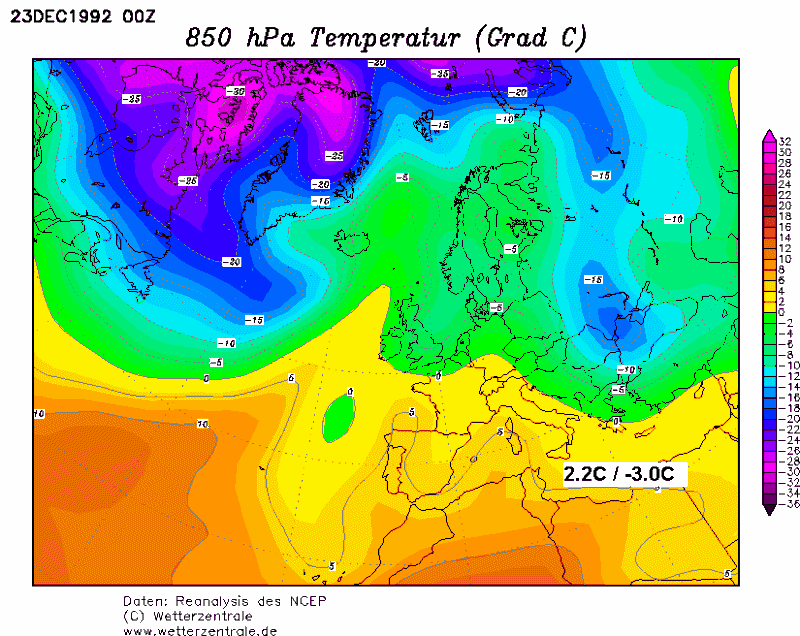 En ideal soğumaları soğuk blok geniş alana yayıldığında ve Karadeniz üzerine sarktığı zamanlarda almışız (kuzeyli rüzgarların Karadeniz’den sıcak hava pompalaması biraz olsun azalmış).. 1992 yılı dışında soğuk çekirdek bize ulaşamamış, hep kıyımızdan köşemizden geçmiş.. 850 milibarda en kötü -10C olmazsa olmaz gibi görünüyor… 19 Aralık 2001 sinoptik görünümü, önümüzdeki hafta sonu bizi etkileyecek olan sistemin sinoptik görünümüne çok benziyor (Merkez Romanya civarı).. Gündüz sıcaklıkları (animasyonda gözükenler) sürekli sıfırın üstünde, yani “diz boyu kar”, “2004 geri dönüyor” gibi cümleler İstanbul için kaf dağının ardında görünüyor… Son modellere göre hafta sonu gelecek sistem o kadar büyük ki Mısır’ın ortalarına kadar ulaşabilir… Bence yoğurdun kaymağını Güneydoğu Marmara, Batı Karadeniz, İç Anadolu’nun Kuzey ve Batısı yiyecek…”