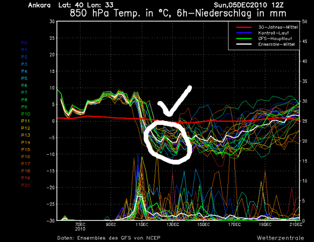 Neredeyse düz olan kırmızı çizgi, Ankara’nın bulunduğu enlem-boylam ve deniz seviyesinden yaklaşık 1500 metre yükseklik için 30 yıllık ortalama sıcaklığı gösteriyor. GFS modelinin Ankara için ürettiği olası sıcaklıkların hepsinin (öteki renkli çizgiler), 12 Aralık civarında 30 yıllık ortalamanın altında olduğunu görüyoruz. Bu da bize, kar yağışına yetecek soğumanın neredeyse kesinleştiğini gösteriyor.