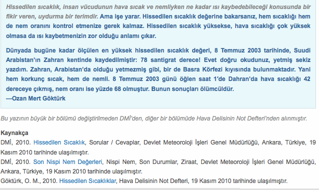 Yerbilimleri.com adlı siteyi işleten nazik insanlar, birçok alıntıya başvuruyorlar. Bakın benim Hissedilen Sıcaklıklar yazımın neredeyse tamamını kullandıktan sonra altına ne yazmışlar.