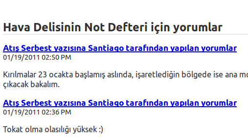 Sağ sütunda “Son 100 Yorum (tarih sıralı)” diye bir link var. Ona tıkladığınızda açılacak olan yeni sayfada, blogun bütün sayfa ve başlıklarına yapılmış olan son 100 yorumu tarih sırasıyla görebilirsiniz. (Görüntülenen yorum sayısını arttırabilirim ama yeni açılan sayfanın şişmemesi ve kolay yüklenmesi için 100’de kestim).