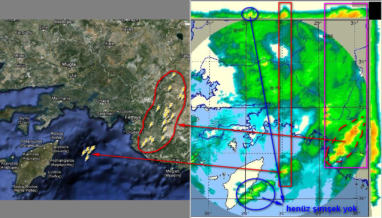 “Radarın “maks” görüntüsü ile şimşeklerin oluşum yerini gösteren ilginç bir karşılaştırmayı koyuyorum. “Maks” radar görüntüleri, aslında bulutun hangi dikey uzanıma sahip olduğunda şimşek oluşturacağını göstermesi bakımından oldukça önemli, PPI görüntüleri tek bir seviyeyi gösterdiğinden (ürünler hakkında bilgi için buraya bakınız) bulutun dikey uzanımını anlamak mümkün değil. PPI görüntüleri ~300 km. mesafeyi kapsadığından uzak mesafelerdeki bulut oluşumları hakkında daha detaylı bilgiler veriyor. Ayrıca yeni kurulan İzmir ve Muğla radarları, bildiğim kadarıyla İstanbul, Balıkesir, Zonguldak ve bozuk Ankara radar grubundan farklı olarak polarimetrik kabiliyete sahip radarlar olduğundan (bilgi burada) kuru ve ıslak kar, dolu çapı ayrımları gibi üstün yeteneklere sahip radarlar.”