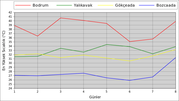(Grafiğe Gökçeada ve Bozcaada’yı da ekledim, Bozcaada da etrafından çok daha serin bir yer. Buraya gelmeden iki gün de oradaydım, denizi de havası da çivi gibi.)