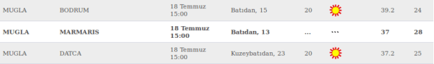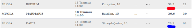 Ek: Yukarıda göstermiştim, Datça bugün saat 15’te (rüzgar karadan eserken) 37 derece iken onun bir saat öncesinde (yerel meltem mekanizması sonucu rüzgar denizden, yani Datça’nın güneydoğusunda eserken) 30 dereceymiş.