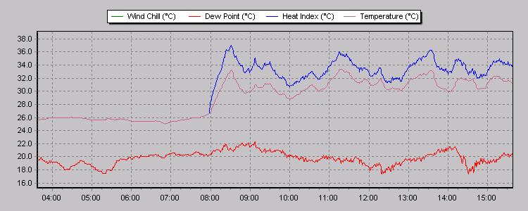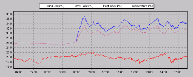 Yukarıdaki grafikler otomatik meteoroloji istasyonuna ait. Gördüğünüz gibi geceleyin 28 derece giden sıcaklık saat 3’ten sonra birdenbire tırmanarak 30.5 dereceye çıkmış! Bunun sebebinin de doğu ağırlıklı esen rüzgarın hızının (nedense) artmasından ve ortaya çıkan hafif fön etkisinden olduğu anlaşılıyor (meteoroloji istasyonunun arka ve solundaki (güney ve doğu) tepelere (370 metreye kadar çıkıyor) dikkat!). Belki de bizim evin orada olmadı bu olay, uyuyordum, takip edemedim.