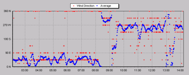 Pembe çizgi Yalıkavak’ta dün ölçülen sıcaklıklar, gördüğünüz gibi otomatik istasyon çok sık ölçüm yapıyor. Dikkatinizi çekerim: Günün en yüksek sıcaklıklarından birinin (yaklaşık 33 derece) ölçüldüğü saat sabah 8.30 ! Güneş Yalıkavak’ı ısıtmaya başlamış ve o saatte meltem mekanizması henüz devreye girmemiş. 8.30’dan itibaren batı yönlü (denizden doğru) rüzgarlar başlıyor ve sıcaklık saat 10’da 29 dereceye geriliyor. Gün içinde aynı şey birkaç defa tekrarlanmış. Rüzgar grafiği aşağıda: