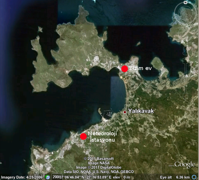 Rüzgar Yalıkavak’ta güney ve batı yönlerden esiyor. Yani yerel meltem mekanizmalarına uygun gözlemler yapılıyor. Güney tarafı kara olan meteoroloji istasyonu çevresi daha sıcak. (Bizim ev ile meteoroloji istasyonu arasındaki kuş uçumu mesafe 3 km)