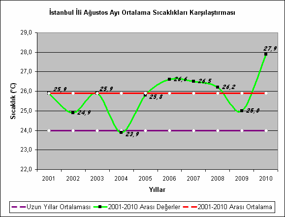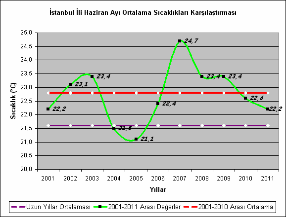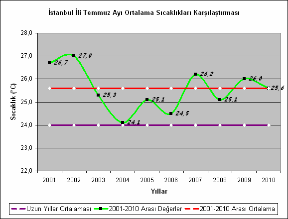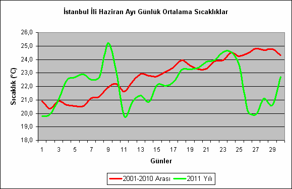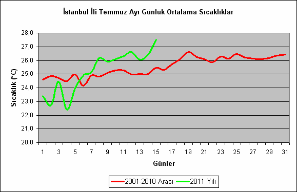 Temmuz ayı son on yıla göre mevsim normallerinin altında başladı ancak sonradan sıcaklıklar aniden yükseldi. Temmuz ayı uzun yıllar ortalaması yaklaşık 24°C civarında. 2001–2010 arası ortalama ise 25,6°C civarlarında. İnanılmaz bir artış var. 2011 Temmuz ayının ilk 15 gününün ortalaması ise 25,2°C. Görüldüğü gibi bu ay uzun yıllar ortalamasının hayli üzerinde geçeceğe benziyor ve an itibariyle uzun vadede modeller sıcaklığın daha da artacağını gösteriyor.