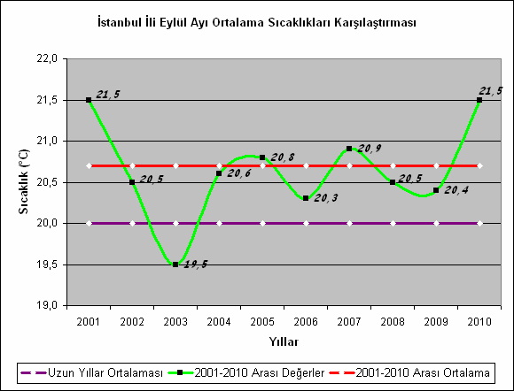 Yaptığım bu çalışmada İstanbul Atatürk Havalimanı meteorolojik verileri temel alınmıştır. Ortalama sıcaklık değerleri “Gerçek Ortalama Sıcaklık” olarak kullanılmıştır. (Bir gün içinde her saat başı kaydedilen sıcaklıkların ortalaması). Geçmiş dönemlerle karşılaştırma yaparken ise benim hesapladığım son 10 yıllık sıcaklık ortalamalarını ve DMİ’nin web sitesinde yer alan uzun yıllar (1975–2011) ortalama sıcaklık değerlerini kullandım.