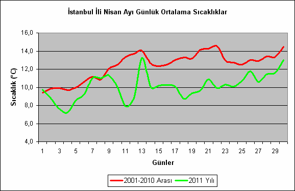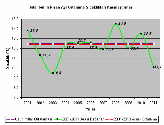 * Son on senede (2011 hariç) Nisan ayı ortalama sıcaklığı uzun yıllar ortalama sıcaklığı ile aynıdır.