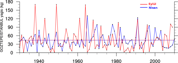 Üzerine tıklayarak grafiği büyütebilirsiniz. Nisan ayını da (maviyle) gösterdim, çünkü yağış ortalaması Eylül’le neredeyse aynı (düz mavi çizgi Nisan’ın, düz kırmızı çizgi Eylül’ün uzun yıllar ortalaması). Dikkatinizden kaçmamıştır, Nisan’ın ekstremleri Eylül’ünkilerden çok daha makul, yani Eylül yağışları daha sık dibe vurup tavan yapıyor. Bir başka deyişle, Eylül yağış bakımından zaten (Çihiro’nun tabiriyle) istikrarsız bir ay, hiç yağış da olmasa, 2009’daki gibi seller de aksa, klimatolojik olarak çok anormal olmuyor… Teknik tabirle de söyleyelim hadi: İstanbul’da Eylül yağışlarının standart sapması yüksek. İstanbul’la birlikte deniz kenarındaki yerlerin birçoğu için de bu böyledir…