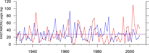 Ama iç bölgeler için durum biraz da olsa farklı. Oralarda hem Eylül ayı yağış ortalamaları çok düşük (yaz aylarıyla neredeyse aynı) hem de istikrarsızlık nispeten daha az, diğer aylarla kıyaslanabilir seviyede. Aşağıda Kastamonu’nun Eylül yağışlarını (kırmızı), Ocak yağışlarıyla (mavi) birlikte verdim.