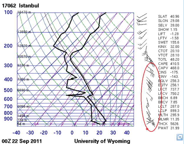 Tekirdağ’dan meteoroloji balonu atılmadığı için en yakın merkez olan İstanbul skew-t diyagramına bakacak olursak kararsızlık şartlarının mevcut olduğunu görüyoruz. Bir çok kararsızlık indeksi de limit değerlerin üzerinde. Örneğin K indeks 32, Lifted indeks -1,28. Tekirdağ için bu şartların kuvvetli yağışa daha uygun olduğunu söyleyebiliriz. Rüzgar profili incelenecek olursa yerdeki hafif rüzgar dışında genellikle güneydoğulu ve de kuvvetli olduğunu görüyoruz.