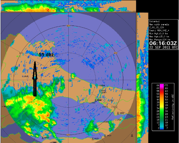22 Eylül sabah saatlerinde Tekirdağ üzerinde 55 dbz civarında reflektivite değerleri görülüyor. (Radarda, gönderilen elektromanyetik dalgaların bulut içerisindeki damlacığa çarpıp geri dönmesiyle oluşan reflektivite (yansıma) değerlerini görürüz. Damlacık çapı büyüdükçe değer de büyür. )