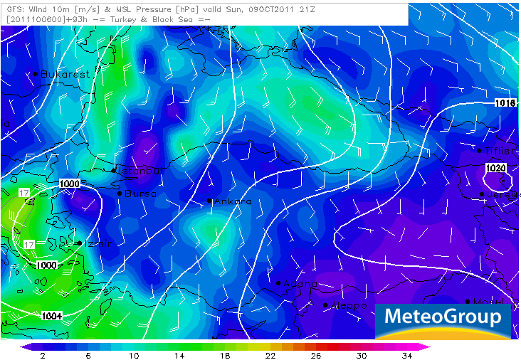 Bunun böyle olduğu yetmiyormuş gibi, bir de bu alçak basınç, yüzey rüzgarlarının denizden kıyı bölgelerimize doğru esmesine ve denizden ekstra nem taşınmasına sebep oluyor. Aşağıdaki rüzgar çubuklarından bunu görüyoruz: