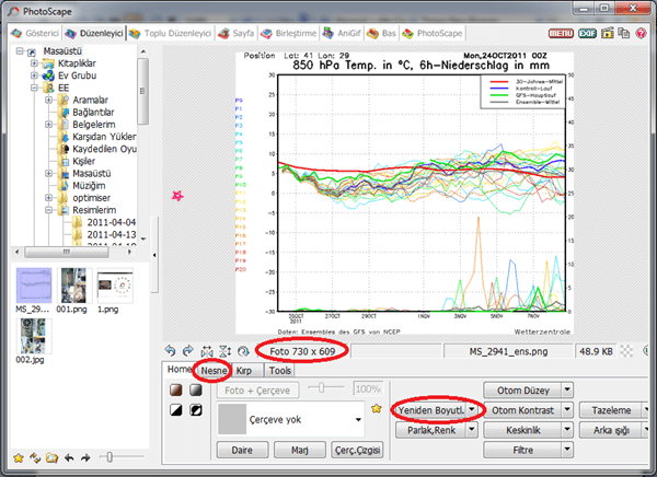 Peki, orijinal resmimizi nasıl küçülteceğiz? Yuvarlak içine aldığım bölümlerden “yeniden boyutlandırma”nın yanındaki oku tıklıyoruz.
