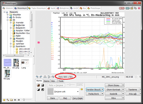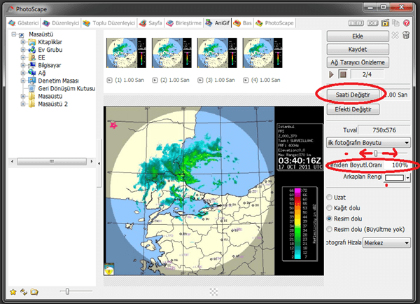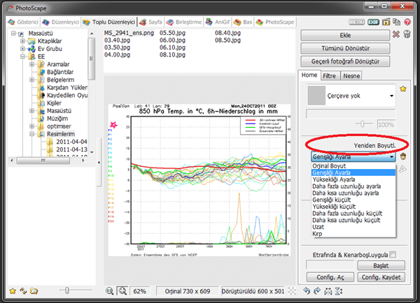 Bu bölümde birçok resmi aynı anda düzenleyebiliyorsunuz. Örneğin radar görüntülerini kaydettiniz ve elinizde 20 tane resim var. Hepsini seçip sürükle-bırak yöntemiyle programa taşıyoruz. Bu bölümde programla ne yaparsak yapalım resimlerin tümü degişiyor. Yani genişliği 600 piksel olarak ayarladıgımızda tüm resimlerin boyutları 600 piksel oluyor. Metin ve diğer nesneleri de eklersek tüm resimlerde aynı görüntü aynı yerde çıkıyor. “Tümünü dönüştür” düğmesini tıklayarak işlemi sonlandırıyoruz.