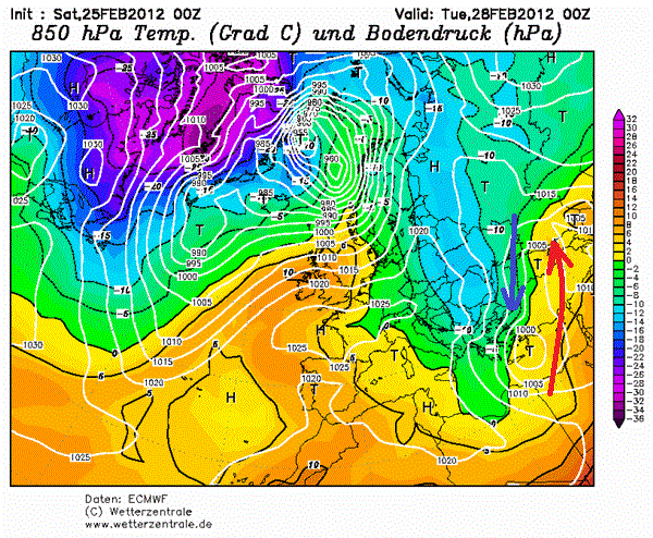 ECMWF modelinin önümüzdeki Salı günü için ürettiği yer seviyesi basıncı (beyaz çizgiler) ve 850 mb (yer seviyesinden yaklaşık 1500 metre yükseklik) sıcaklık haritası. Mavi ok soğuk havanın, kırmızı ok ise ılık havanın hareketini gösteriyor.