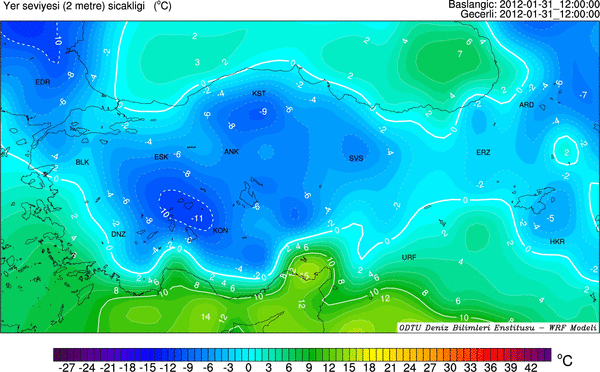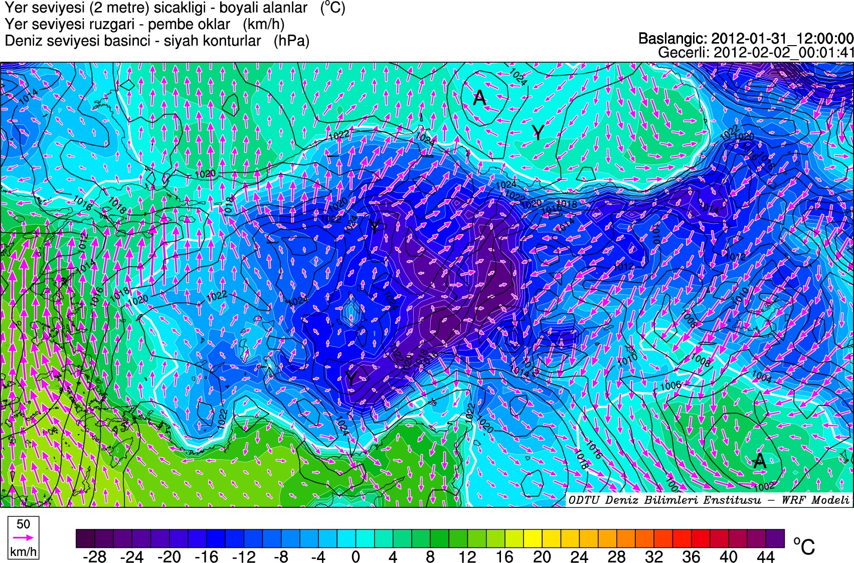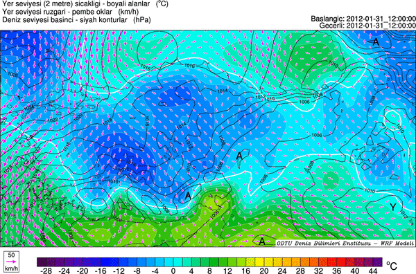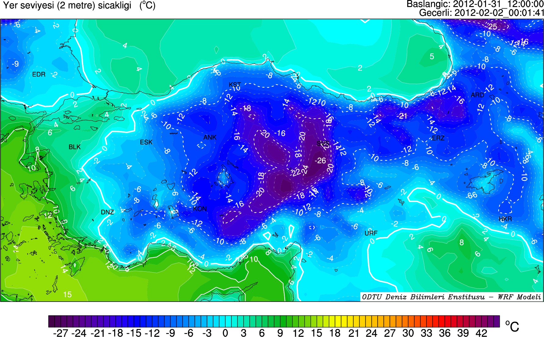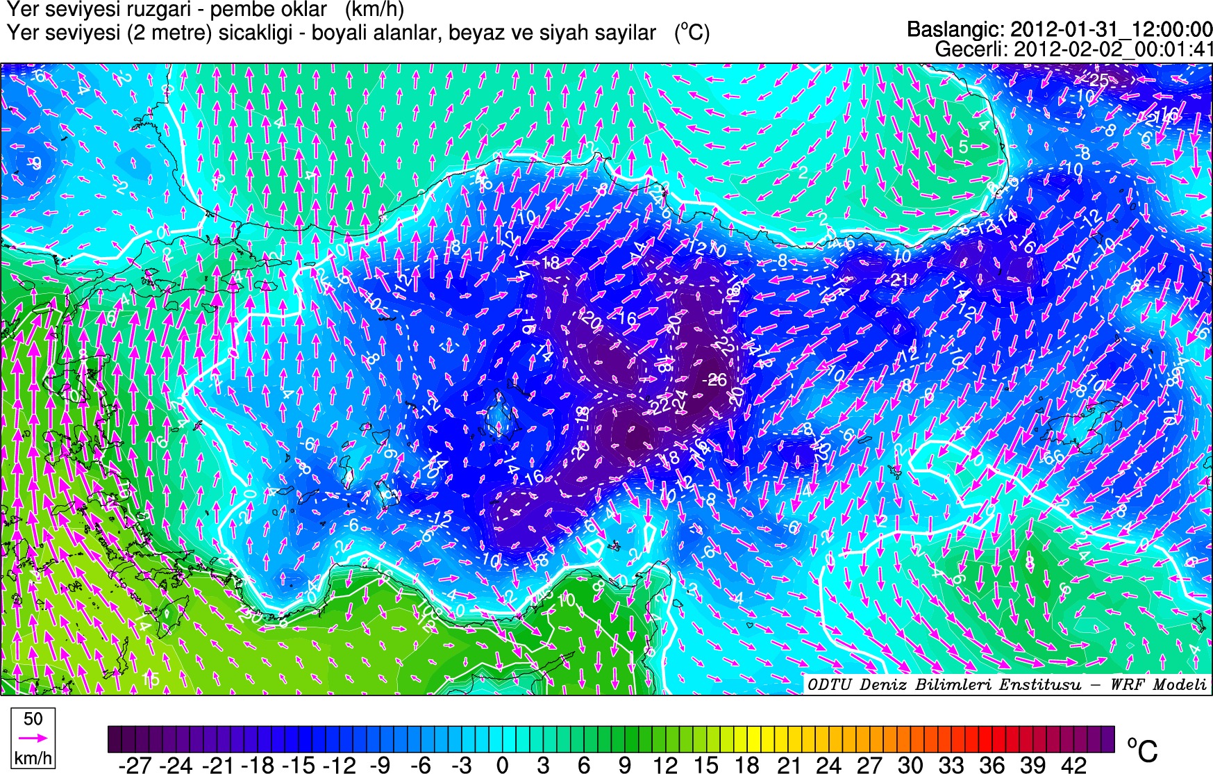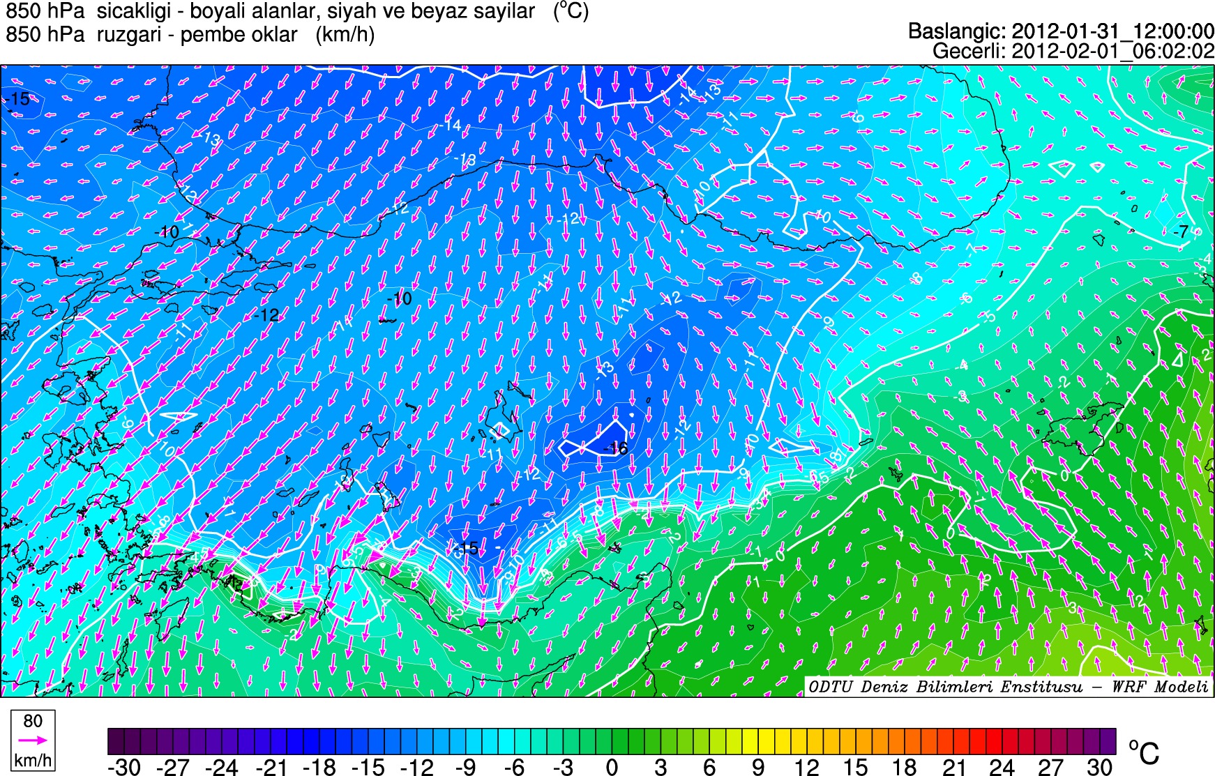 Bir süredir WRF isimli kısa vade / sınırlı alan hava tahmin modelinin çıktılarını görselleştirme işi ile uğraşıyorum. Önümüzdeki zamanlarda sistemi her gün çıktı üretir hale getirdiğimizde, siz sayın hava delilerinin ve deli olmayan meraklıların bakmaya doyamayacağı harita ve grafiklerle huzurlarınızda olmak istiyoruz. Bu amaçla, şimdiye kadar ürettiğim grafiklerden bazı örnekleri bu yazıda sizlerle paylaşıp görüşlerinizi alacağım. Her türlü övgü, eleştiri ve önerinizi yazınız, grafikleri hem işlevsellik, hem anlaşılabilirlik, hem de estetik bakımdan değerlendirelim. Modelin isabet yeteneği ile ilgili de konuşabiliriz, ama unutmayın ki alansal çözünürlük halen düşük (24 km) ve veri asimilasyonu da henüz başlamadı.