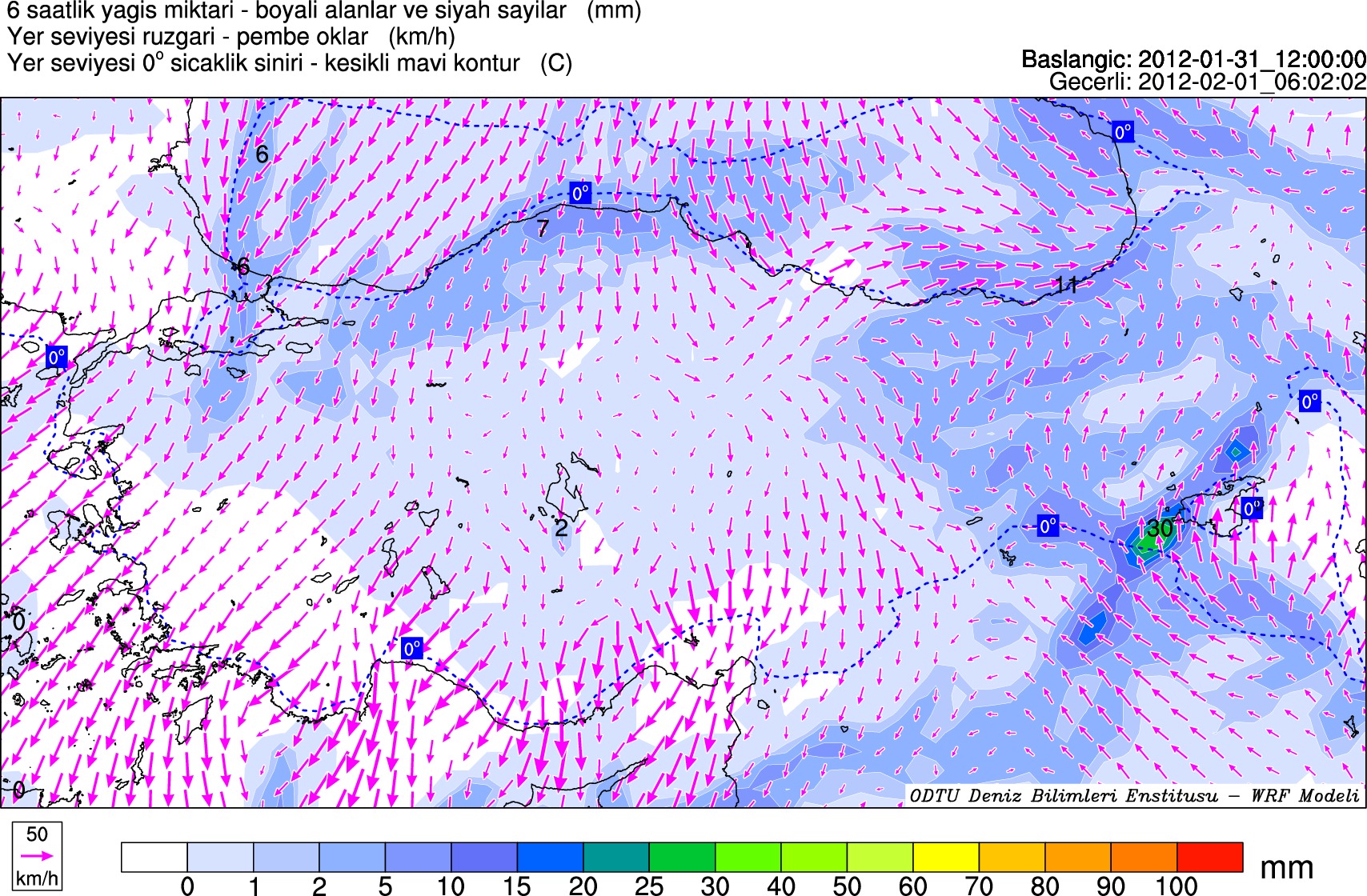 Yağış miktarları ile yer seviyesi 0 derece sıcaklık sınırı, yer seviyesi rüzgarları gibi farklı çıktıları aynı resme yerleştirmeyi çok iyi düşünmüşsün.