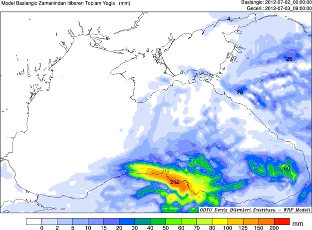 Kurak mevsimi bulunmayan Orta ve Doğu Karadeniz kıyılarında Temmuz yağmurları sıkıntıya yol açacak gibi görünüyor. Aşağıdaki haritada, WRF modelinin dün geceden yarın öğlene kadar tahmin ettiği toplam yağış miktarını görüyorsunuz. Üzerine tıklayıp büyütmeniz mümkün.