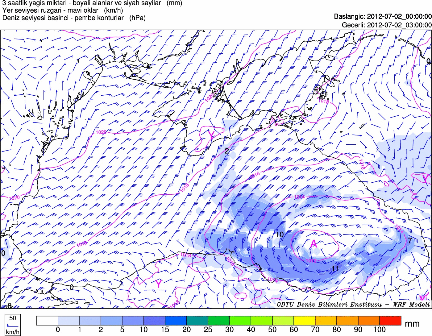 Karmaşık topoğrafya, deniz etkisi gibi faktörlerin çeşitli durumları ve yağış dağılımlarını ortaya çıkardığı anlaşılıyor. Mesela son günlerde bölgeye üst seviyeden sokulan serin hava deniz üzerinde alçak basınç merkezlerinin oluşmasına neden oluyor, bu alçak basınç merkezleri de Kuzey Anadolu ve Kafkas dağ silsilelerinin arasında hapsolup bir ileri bir geri hareket ediyor (olaya dikkatimi çeken Emin Özsoy hocama teşekkür ederim). Alçak basıncın konumuna göre şekillenen yer seviyesi rüzgarları, dolayısıyla bu rüzgarların denizin nemini taşıdıkları yerler, yağışın yoğunlaştığı yerler olarak göze çarpıyor. Aşağıdaki animasyonda rüzgarın deniz üzerinde uzun süre estiği yerlere dikkat edin (animasyonu tıklayıp büyütebilirsiniz).