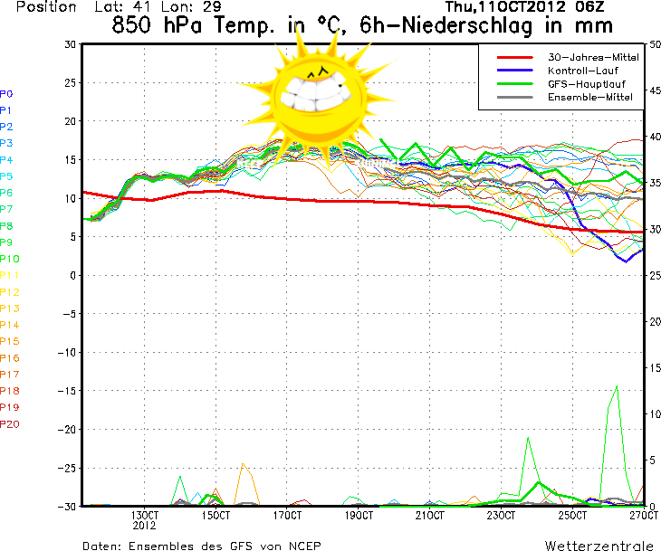Yukarıdakine GFS diyagramı deniyor, okuması buraya tıklayıp bir 10 dakikanızı ayırırsanız çok kolay. En kısa özeti: çizgiler kırmızı kalın çizginin üzerinde toplandıysa havalar normalden ılık gidecek demektir. Arada kısa süreli yağmur geçişleri memleketin her yerinde olabilir, mevsim sonbahar, belki Trakya ve Kıyı Ege’de ‘geçiş’ten fazla da yağabilir bu hafta sonu… Fakat bundan başka, bir hafta – on gün ciddi bir şey olmayacak gibi…