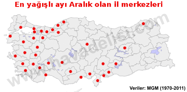 Aralık yağışı, kışların kurak olduğu gerçek kara iklimi görülen Doğu Anadolu’nun kuzeyinde, kısmen de Kastamonu-Çorum ve Kayseri-Sivas civarında diğer aylara göre azalıyor.