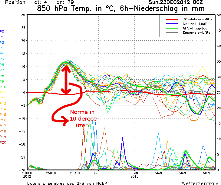 😀 Dediğin gibi 20 derece, rekorları göz önüne aldığımızda abartılı bir değer değil fakat bu perşembe günkü ısınma karakteristik olarak farklı görünüyor. 1 Ocak 2010 ve 3 Aralık 2010 sıcaklıkları güneyden başlayarak İç Anadolu ve Doğu Anadolu’yu bile 10’lu değerlerin üzerine çıkaracak kadar etkili ve büyük çaplıymış ve Kuzey Afrika’nın kalbinden kopmuş gelmiş yanılmıyorsam 😀