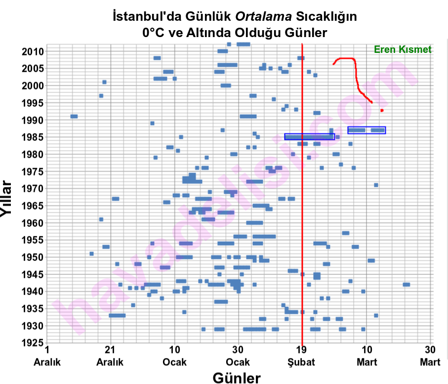 Şimdi, öncelikle 1985 ve 1987 efsanelerine dikkatinizi çekmek istiyorum. Her ikisini de mavi dikdörtgenle gösterdim. 1985 soğuk olarak gerçek bir efsaneymiş. Grafiğe göz kararı baktığımızda 1970′ten sonra 0′ın altındaki günlerin sayısında belirgin bir azalış olduğunu görüyoruz.