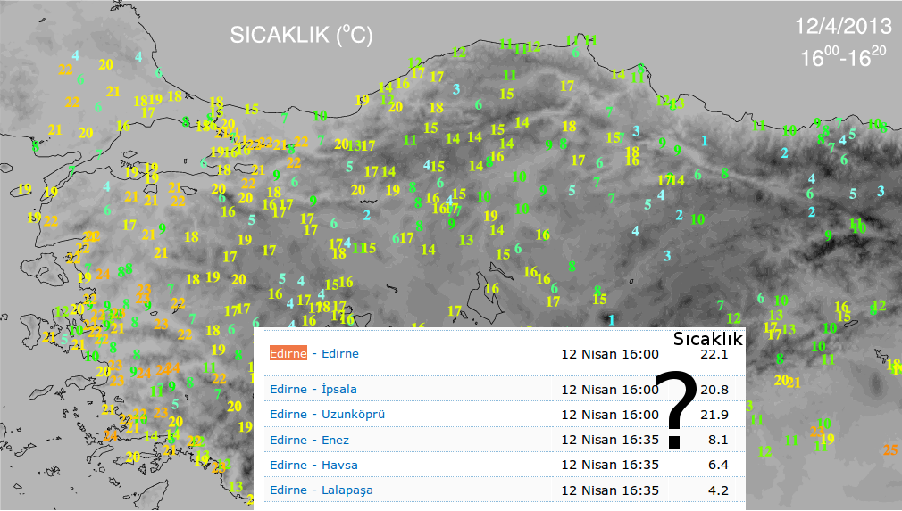 Şekilde, bugün saat 16 itibariyle Türkiye’nin özellikle batısında renklerin birbirine karıştığını, sıcaklıkların çok kısa mesafelerde bile ciddi farklar göstererek onlarca mikroklima bölgesinin ortaya çıkışını haber verdiğini görüyorsunuz. Bu, dünya para verip satın aldığı otomatik istasyonlardan gelen verileri doğru dürüst yayınlamayı bile beceremeyen, yani harcadığı paraları aslında doğrudan çöpe atmış olan meteoroloji kuruluşlarına sahip ülkelere Allah’ın verdiği bir ceza olarak biliniyor. Sonuç olarak Edirne Merkez’den Lalapaşa ilçesine giden birisi sıcaklığın 18 derece birden düşmesi sonucu hastalanacak. Kurunun yanında yaş da yanacak.